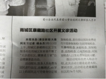 我院公益健康普查义诊活动深入人心,真正做到关心、关爱社会老年人群的身体健康,活动开展以来不但受到社区居民的一致好评,还广为社会关注,本次活动受到“雅安新报”记者的采访和报道。为更好的向社区居民提供卫生医疗服务,便利市民,我院也会将义诊活动陆续走进社区的各个大院,将义诊活动一直坚持下去让更多的社区老人受益。