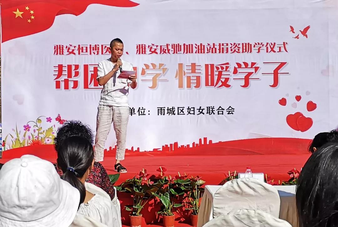 此次活动由雨城区妇联主办,雅安恒博医院、雅安威驰加油站/名山玉丰加油站各捐资20000元,为10名雅安田家炳中学、10名雅安第二中学以优异成绩考上大学而又家境困难的应届高考生,分别提供上大学资金捐助2000元。
